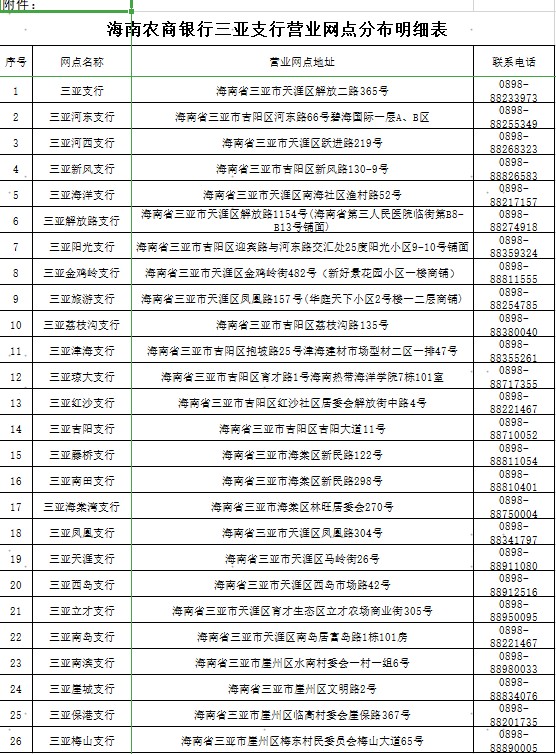 附件:海南農(nóng)商銀行三亞支行營業(yè)網(wǎng)點(diǎn)分布表