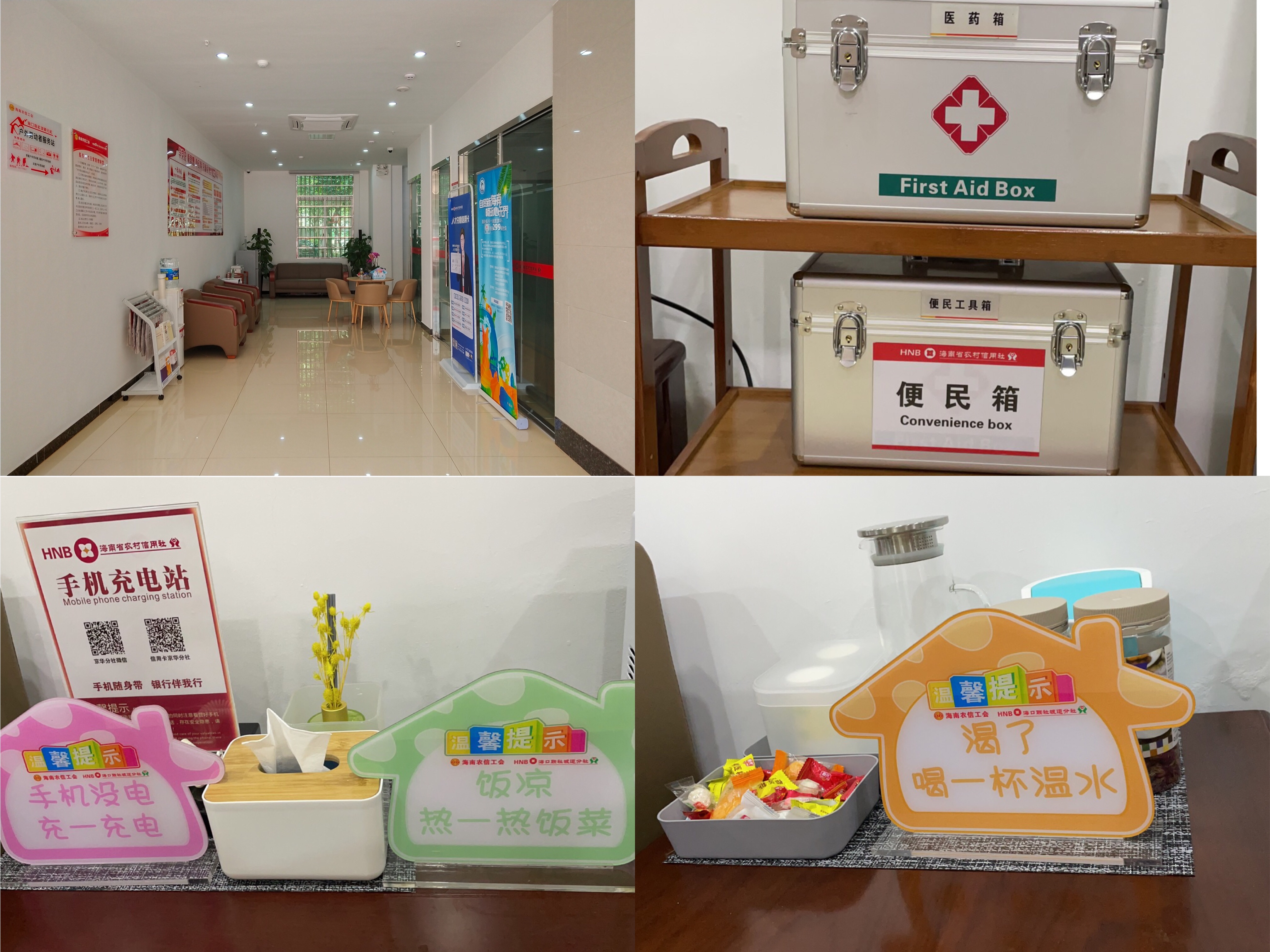 坡道分社除了為戶外勞動(dòng)者提供臨時(shí)歇息場(chǎng)所,冷熱水服務(wù),提供微波爐加熱飯菜服務(wù),提供充電設(shè)備,提供應(yīng)急藥品,提供如廁服務(wù)外,還在“六個(gè)一”要求基礎(chǔ)上,不斷拓展延伸服務(wù)項(xiàng)目,提供更規(guī)范、更細(xì)化、更周到的服務(wù),形成了??诼?lián)社獨(dú)具特色的“十個(gè)一”服務(wù)。“十個(gè)一”服務(wù)新增的四項(xiàng)是提供飯菜保鮮,專用就餐桌椅,便民服務(wù)箱(內(nèi)含雨傘、針線包等8項(xiàng)生活用品),提供水果、餅干、泡面食物等服務(wù)。坡道分社作為戶外勞動(dòng)者服務(wù)站點(diǎn)之一,已經(jīng)成為服務(wù)群眾的重要窗口和愛(ài)心驛站,成為服務(wù)戶外勞動(dòng)者的暖心工程、文明工程和民生工程。
